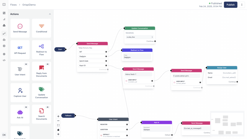 • Test edin: Akışı tamamladıktan sonra mutlaka Preview Widget üzerinden gerçek kullanıcı gibi test yapın.